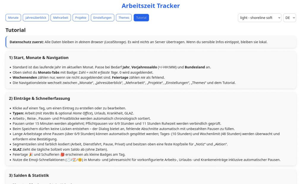 Es werden keine Daten auf dem Server gespeichert. Alle Speichervorgänge erfolgen lokal im Browser des Rechners oder mobilen Geräts. Deine Daten bleiben bei dir auf deinem Gerät!