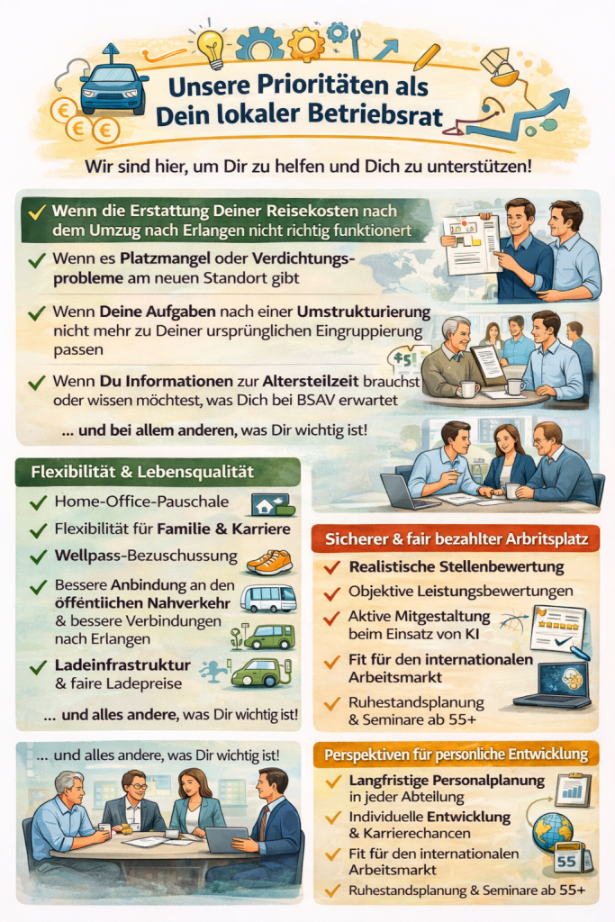 Unsere nicht-gewerkschaftliche Gruppe versteht sich als praktische, lokale Interessenvertretung mit klaren Prioritäten. Basierend auf unserem „#BestPlaceToWork“-Ansatz sind die Kernziele: