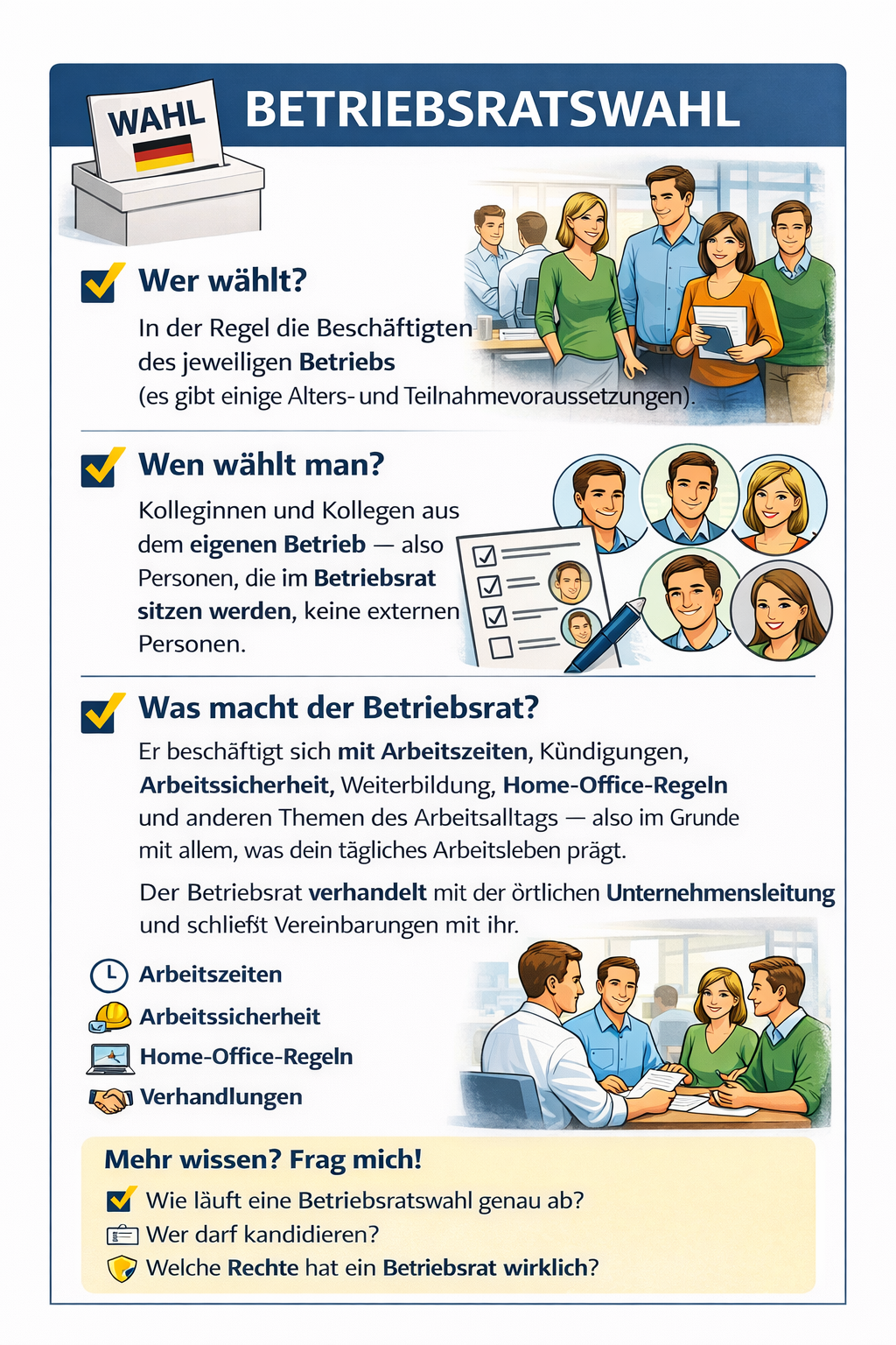 - Kurz gesagt: Eine Betriebsratswahl dreht sich um Persönlichkeit, Nähe und Hilfsbereitschaft — nicht um abstrakte Ideologie. Wer zuhört und Dinge für dein Team voranbringt, ist entscheidend.