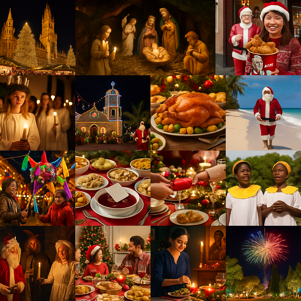 - Rituale: Lichterketten, lautstarke Familienfeiern, Mitternachtsmesse.